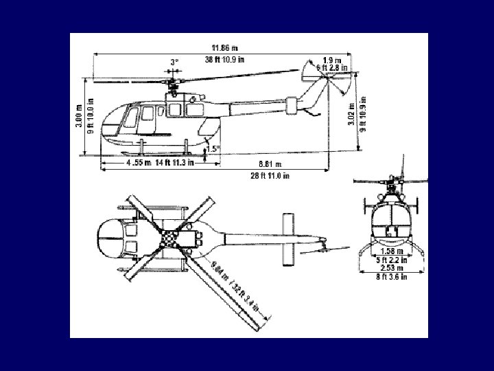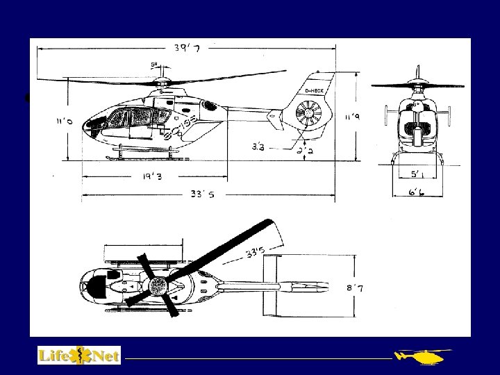 Dimensions and Weight • Total running length – 40 ft • Main rotor diameter – 34 ft • Main rotor height – 11 ft on level ground • Tail rotor height – 2. 2 ft • Maximum gross weight – 6250 lbs. • Can carry up to 350 lb. patient