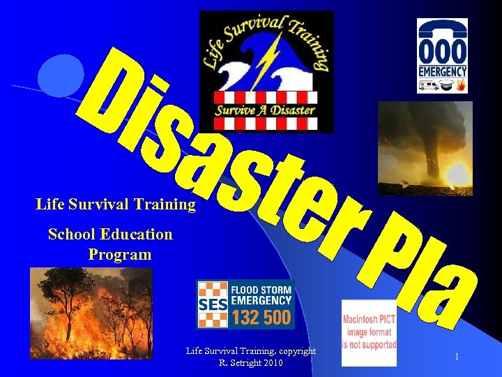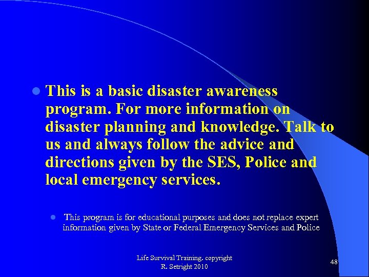 l This is a basic disaster awareness program. For more information on disaster planning and knowledge. Talk to us and always follow the advice and directions given by the SES, Police and local emergency services. l This program is for educational purposes and does not replace expert information given by State or Federal Emergency Services and Police Life Survival Training. copyright R. Setright 2010 48