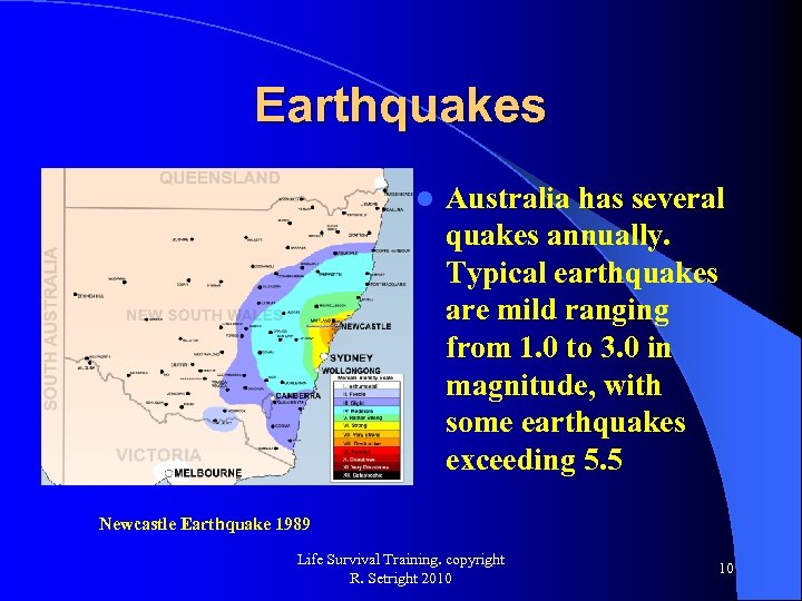 Australian Earthquakes Newcastle has had significant earthquakes. l A severe quake in 1989 caused millions of dollars in damage and loss of life. l Newcastle NSW 1989 Life Survival Training. copyright R. Setright 2010 12