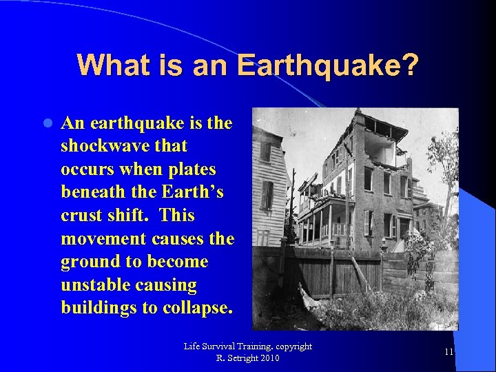 What is an Earthquake? l An earthquake is the shockwave that occurs when plates beneath the Earth’s crust shift. This movement causes the ground to become unstable causing buildings to collapse. Life Survival Training. copyright R. Setright 2010 11