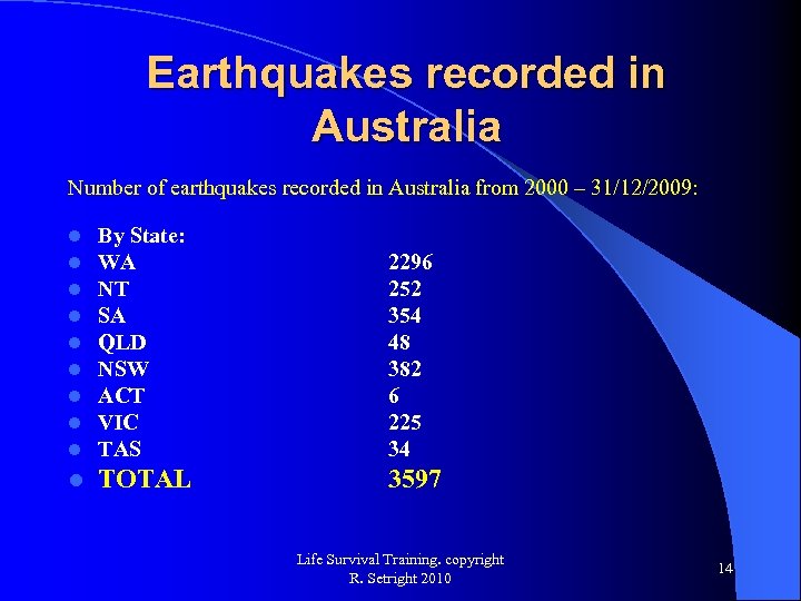 Earthquakes recorded in Australia Number of earthquakes recorded in Australia from 2000 – 31/12/2009: l l l l l By State: WA NT SA QLD NSW ACT VIC TAS 2296 252 354 48 382 6 225 34 l TOTAL 3597 Life Survival Training. copyright R. Setright 2010 14