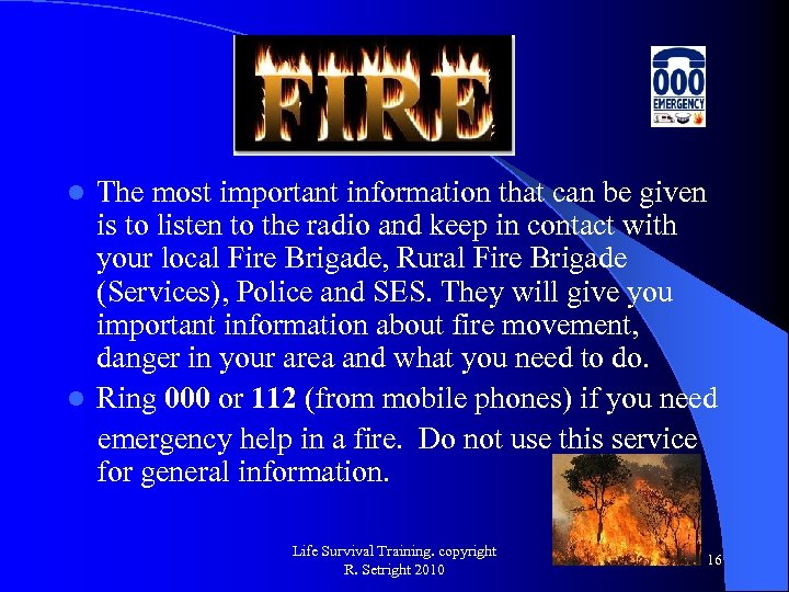 The most important information that can be given is to listen to the radio and keep in contact with your local Fire Brigade, Rural Fire Brigade (Services), Police and SES. They will give you important information about fire movement, danger in your area and what you need to do. l Ring 000 or 112 (from mobile phones) if you need emergency help in a fire. Do not use this service for general information. l Life Survival Training. copyright R. Setright 2010 16