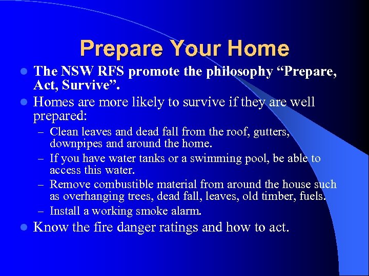 Prepare Your Home The NSW RFS promote the philosophy “Prepare, Act, Survive”. l Homes are more likely to survive if they are well prepared: l – Clean leaves and dead fall from the roof, gutters, downpipes and around the home. – If you have water tanks or a swimming pool, be able to access this water. – Remove combustible material from around the house such as overhanging trees, dead fall, leaves, old timber, fuels. – Install a working smoke alarm. l Know the fire danger ratings and how to act.