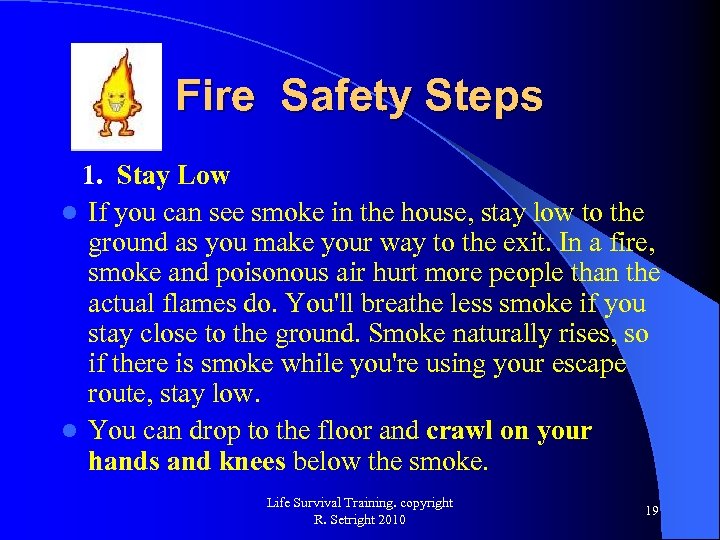 Fire Safety Steps 1. Stay Low l If you can see smoke in the house, stay low to the ground as you make your way to the exit. In a fire, smoke and poisonous air hurt more people than the actual flames do. You'll breathe less smoke if you stay close to the ground. Smoke naturally rises, so if there is smoke while you're using your escape route, stay low. l You can drop to the floor and crawl on your hands and knees below the smoke. Life Survival Training. copyright R. Setright 2010 19