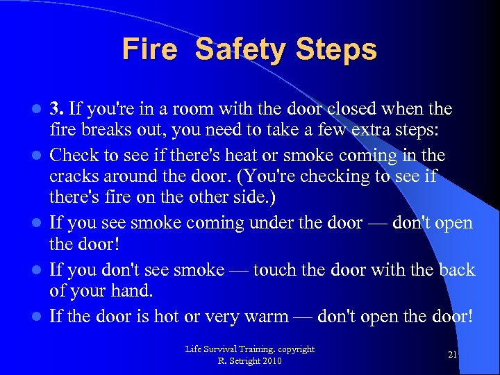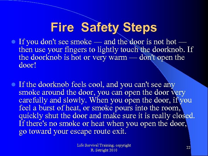 Fire Safety Steps l l l 3. If you're in a room with the door closed when the fire breaks out, you need to take a few extra steps: Check to see if there's heat or smoke coming in the cracks around the door. (You're checking to see if there's fire on the other side. ) If you see smoke coming under the door — don't open the door! If you don't see smoke — touch the door with the back of your hand. If the door is hot or very warm — don't open the door! Life Survival Training. copyright R. Setright 2010 21