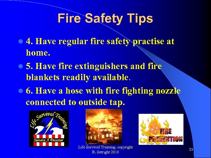 Fire Safety Tips l 4. Have regular fire safety practise at home. l 5. Have fire extinguishers and fire blankets readily available. l 6. Have a hose with fire fighting nozzle connected to outside tap. Life Survival Training. copyright R. Setright 2010 23