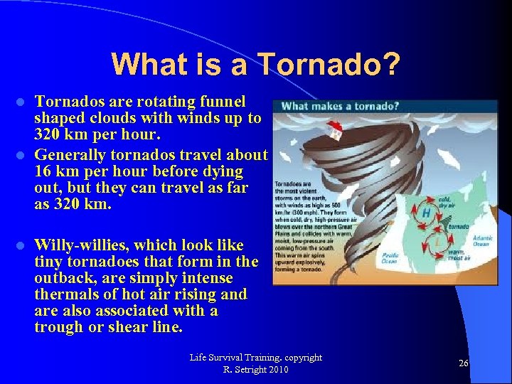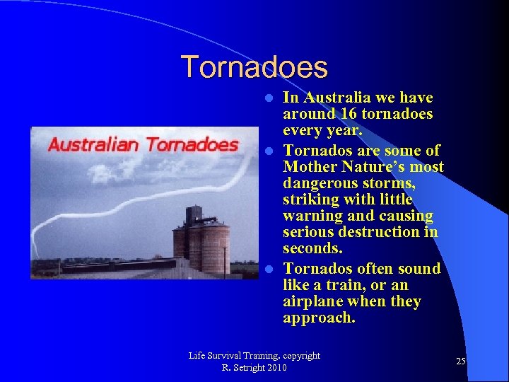 Tornadoes In Australia we have around 16 tornadoes every year. l Tornados are some of Mother Nature’s most dangerous storms, striking with little warning and causing serious destruction in seconds. l Tornados often sound like a train, or an airplane when they approach. l Life Survival Training. copyright R. Setright 2010 25