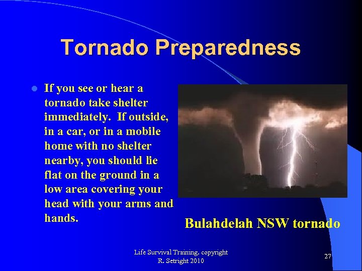 Tornado Preparedness l If you see or hear a tornado take shelter immediately. If outside, in a car, or in a mobile home with no shelter nearby, you should lie flat on the ground in a low area covering your head with your arms and hands. Bulahdelah NSW tornado Life Survival Training. copyright R. Setright 2010 27
