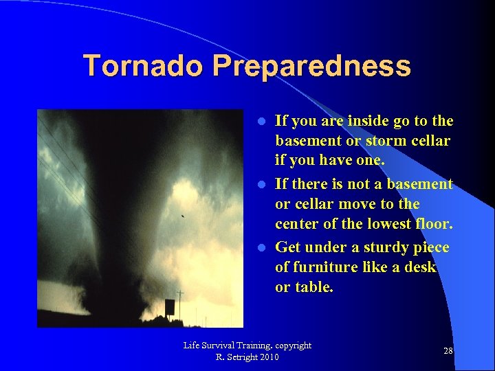 Tornado Preparedness If you are inside go to the basement or storm cellar if you have one. l If there is not a basement or cellar move to the center of the lowest floor. l Get under a sturdy piece of furniture like a desk or table. l Life Survival Training. copyright R. Setright 2010 28
