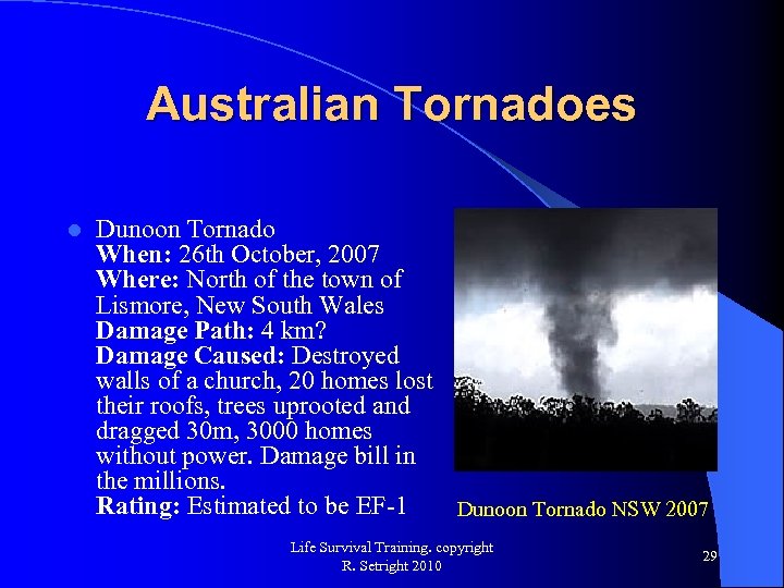 Australian Tornadoes l Dunoon Tornado When: 26 th October, 2007 Where: North of the town of Lismore, New South Wales Damage Path: 4 km? Damage Caused: Destroyed walls of a church, 20 homes lost their roofs, trees uprooted and dragged 30 m, 3000 homes without power. Damage bill in the millions. Rating: Estimated to be EF-1 Dunoon Tornado NSW 2007 Life Survival Training. copyright R. Setright 2010 29
