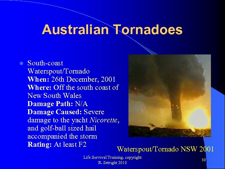 Australian Tornadoes l South-coast Waterspout/Tornado When: 26 th December, 2001 Where: Off the south coast of New South Wales Damage Path: N/A Damage Caused: Severe damage to the yacht Nicorette, and golf-ball sized hail accompanied the storm Rating: At least F 2 Waterspout/Tornado NSW 2001 Life Survival Training. copyright R. Setright 2010 30