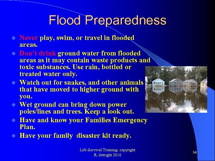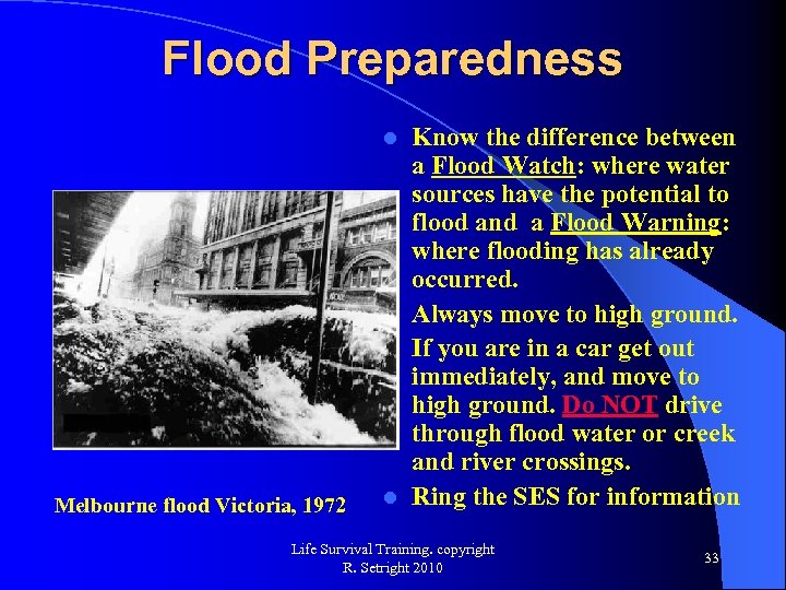 Flood Preparedness Know the difference between a Flood Watch: where water sources have the potential to flood and a Flood Warning: where flooding has already occurred. l Always move to high ground. l If you are in a car get out immediately, and move to high ground. Do NOT drive through flood water or creek and river crossings. l Ring the SES for information l Melbourne flood Victoria, 1972 Life Survival Training. copyright R. Setright 2010 33