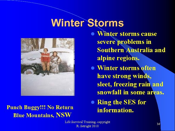 Winter Storms Winter storms cause severe problems in Southern Australia and alpine regions. l Winter storms often have strong winds, sleet, freezing rain and snowfall in some areas. l Ring the SES for information. l Punch Buggy!!! No Return Blue Mountains, NSW Life Survival Training. copyright R. Setright 2010 36