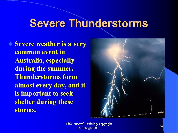 Severe Thunderstorms l Severe weather is a very common event in Australia, especially during the summer. Thunderstorms form almost every day, and it is important to seek shelter during these storms. Life Survival Training. copyright R. Setright 2010 38