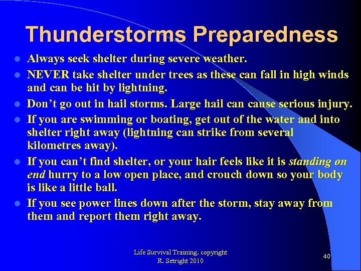 Severe Thunderstorms Severe storms usually have heavy rain, strong winds, and lightning. l Though the thunder you hear in these storms is scary it is the lightning that is dangerous. l Life Survival Training. copyright R. Setright 2010 39