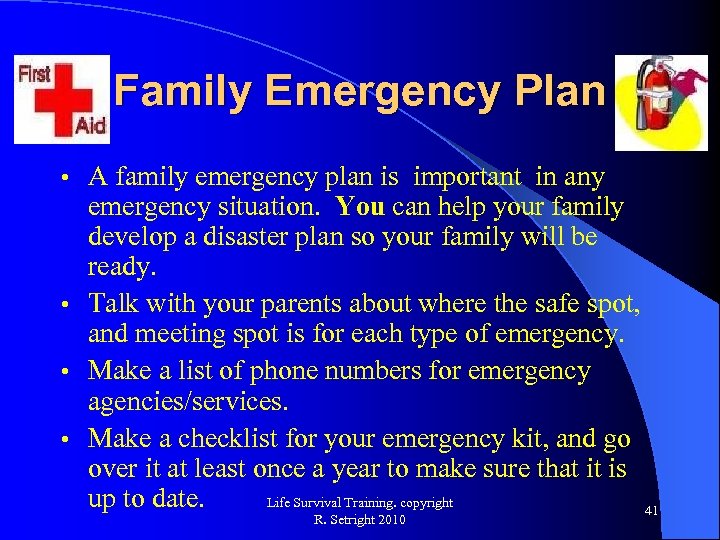 Family Emergency Plan A family emergency plan is important in any emergency situation. You can help your family develop a disaster plan so your family will be ready. • Talk with your parents about where the safe spot, and meeting spot is for each type of emergency. • Make a list of phone numbers for emergency agencies/services. • Make a checklist for your emergency kit, and go over it at least once a year to make sure that it is Life Survival Training. copyright up to date. 41 • R. Setright 2010