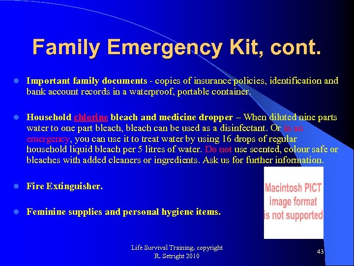 Family Emergency Kit, cont. l Important family documents - copies of insurance policies, identification and bank account records in a waterproof, portable container. l Household chlorine bleach and medicine dropper – When diluted nine parts water to one part bleach, bleach can be used as a disinfectant. Or in an emergency, you can use it to treat water by using 16 drops of regular household liquid bleach per 5 litres of water. Do not use scented, colour safe or bleaches with added cleaners or ingredients. Ask us for further information. l Fire Extinguisher. l Feminine supplies and personal hygiene items. Life Survival Training. copyright R. Setright 2010 43