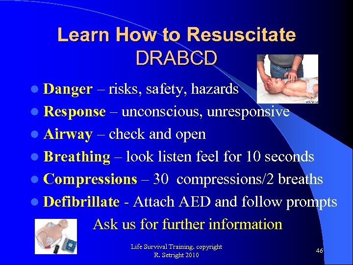 Learn How to Resuscitate DRABCD l Danger – risks, safety, hazards l Response – unconscious, unresponsive l Airway – check and open l Breathing – look listen feel for 10 seconds l Compressions – 30 compressions/2 breaths l Defibrillate - Attach AED and follow prompts Ask us for further information Life Survival Training. copyright R. Setright 2010 46