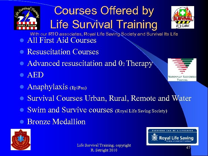 Courses Offered by Life Survival Training With our RTO associates, Royal Life Saving Society and Survival Its Life l l l l All First Aid Courses Resuscitation Courses Advanced resuscitation and 02 Therapy AED Anaphylaxis (Epi. Pen) Survival Courses Urban, Rural, Remote and Water Swim and Survive courses (Royal Life Saving Society) Bronze Medallion Life Survival Training. copyright R. Setright 2010 47