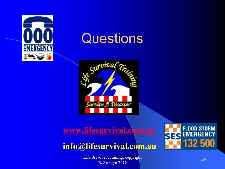 Questions www. lifesurvival. com. au info@lifesurvival. com. au Life Survival Training. copyright R. Setright 2010 49