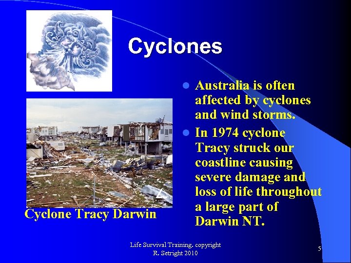 Cyclones Australia is often affected by cyclones and wind storms. l In 1974 cyclone Tracy struck our coastline causing severe damage and loss of life throughout a large part of Darwin NT. l Cyclone Tracy Darwin Life Survival Training. copyright R. Setright 2010 5