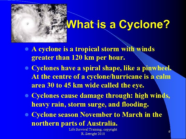 What is a Cyclone? A cyclone is a tropical storm with winds greater than 120 km per hour. l Cyclones have a spiral shape, like a pinwheel. At the centre of a cyclone/hurricane is a calm area 30 to 45 km wide called the eye. l Cyclones cause damage through: high winds, heavy rain, storm surge, and flooding. l Cyclone season November to March in the northern parts of Australia. l Life Survival Training. copyright R. Setright 2010 6