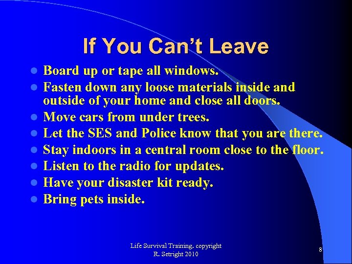 Cyclone Preparedness Keep up with reports on the television, radio, and computer about the cyclone. l Discuss a family cyclone plan with your parent or guardian, and have a disaster kit ready. l Know the difference between a cyclone watch: a cyclone may watch strike in 24 -36 hours; and a cyclone warning: a cyclone warning will be in your area within 24 hours. l Evacuate as soon as notice is given. l Life Survival Training. copyright R. Setright 2010 7