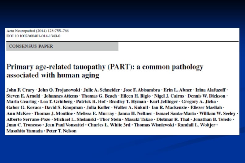 Non AD pathologies in elderly CVD n Non AD tauopathies – PART, grains, CTE, rarely PSP, CBD, and FTLD n LB n Hipp sclerosis n TDP 43 n “aging” n
