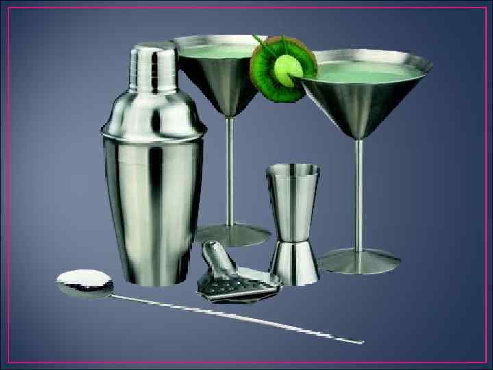 Классификация и характеристика ассортимента Коктейли v Гарнир № 5. Очищенный от кожицы и разделенный на дольки апельсин; подают отдельно на маленьком блюдце. v Гарнир № 6. Цедра цитрусового плода, срезанная узкой длинной лентой. Из нее сворачивают спираль и вешают на край бокала так, чтобы спираль частично была в бокале, после чего наливают в него напиток. v Гарнир № 7. Иней из сахара на кромке бокала. Сахарный песок насыпают на блюдце. Края пустых бокалов протирают долькой лимона или яблока, а затем бокалы частично погружают в сахарный песок на блюдце. На смоченное стекло прилипают кристаллики сахара в виде тонкого белого слоя, напоминающего снежный иней. Затем бокал наполняют напитком так, чтобы не разрушить белый слой «инея» .