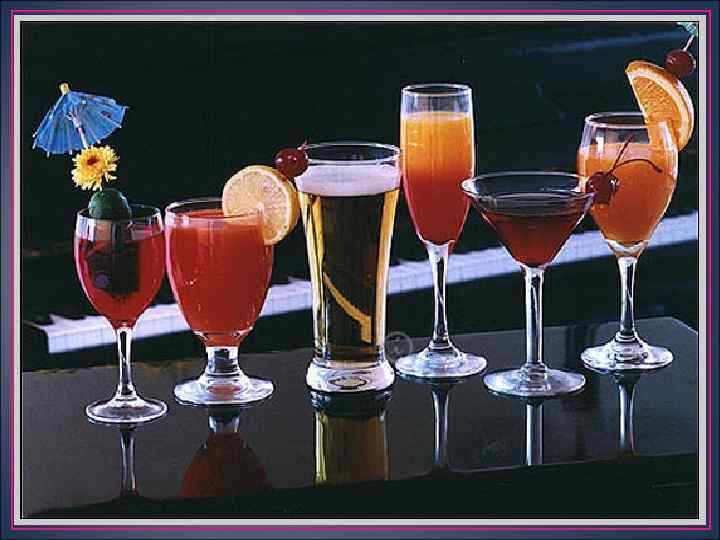 Классификация и характеристика ассортимента Коктейли v Гарнир № 1. Ледяные кубики или шарики. Их получают замораживанием кипяченой воды в специальных пластмассовых формочках в морозильной камере домашнего холодильника. Иногда воду подкрашивают, добавив в нее немного ягодного сиропа или сока. Перед замораживанием в каждую ячейку формы можно положить по одной небольшой ягоде: клюкву, чернику, бруснику или изюм. v Гарнир № 2. Дробленый пищевой лед неправильной формы с частицами значительно меньшими, чем в гарнире № 1. v Гарнир № 3. Кружок лимона или апельсина с насечкой по радиусу, насаженный на край бокала. v Гарнир № 4. Кружок лимона или апельсина, горизонтально помещенный сверху на бокал или рюмку с напитком.
