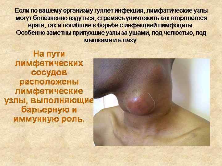 Лимфатическая система Выделяют три звена: лимфатические капилляры, сосуды и протоки. В лимфатические капилляры фильтруется тканевая жидкость, образуя лимфу. Капилляры сливаются и образуют лимфатические сосуды, снабженные клапанами. По их ходу имеются лимфатические узлы (около 460), скопления их на шее под нижней челюстью, в подмышечных впадинах, в паху, локтевых и коленных изгибах, других местах. В узлах лимфа протекает по узким щелям – синусам, где задерживаются и уничтожаются лимфоцитами чужеродные тела. Лимфа от ног и кишечника собирается в левую-, от правой стороны тела – в правую подключичную вены.
