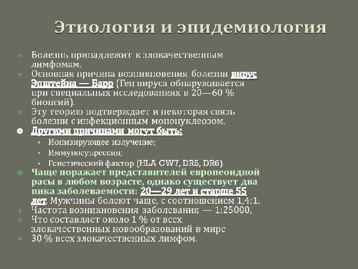 Течение и прогноз • Заболевание развивается медленно, однако неуклонно прогрессирует и ведет к генерализации процесса. Прогноз такой же, как и при других локализациях лимфогранулематоза.