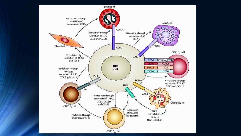 Биологические особенности клеток Ходжкина и Рид-Штенберга Составляют около 5 % от клеточного состава опухоли Гистогенез: преапоптотические В-клетки герминогенного происхождения • • Практически во всех случаях обнаружены клональные клетки Реарранжировки генов тяжелых и легких цепей иммуноглобулинов и соматических гипермутаций генов Ig. V В 25% случаев выявлены деструктивные мутации, приводящие к немедленному апоптозу нормальных В- лимфоцитов Способность избежать апоптоз обусловлена действием трансформирующих факторов , которые вероятно, которы вероятно, возникают еще по попадания В- лимфоцитов в центр размножения. Сниженная экспрессии В клеточных транскрипционных факторов (PU. 1, Oct-2, BOB. 1) T-клеточное происхождение очень редкое
