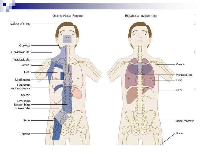 Лимфома Ходжкина n n Безболезненная лимфаденопатия: прогрессирование на протяжение недель, месяцев: Локализация: Лимфоузлы выше диафрагмы – 90% Шейные/надключичные лимфоузлы Средостение (60%)