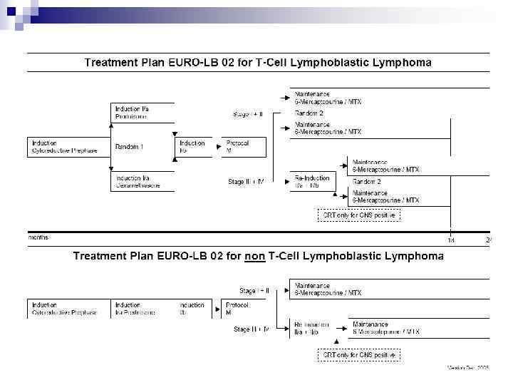 Принципы терапии НХЛ n Лимфобластные лимфомы ¨ Длительный непрерывный курс терапии (как при ОЛЛ) с включением ГКС, винкристини, циклофосана, метотрексата, длительность 24 месяца ¨ Базовый препарат – антрациклны ¨ Непрерываная поддерживающая терапия ¨ Интенсивность инициальной фазы определяется стадией НХЛ ¨ Профилактика поражения ЦНС: люмбальные пункции +/- краниальное облучение Самочатова Е. В. , 2004