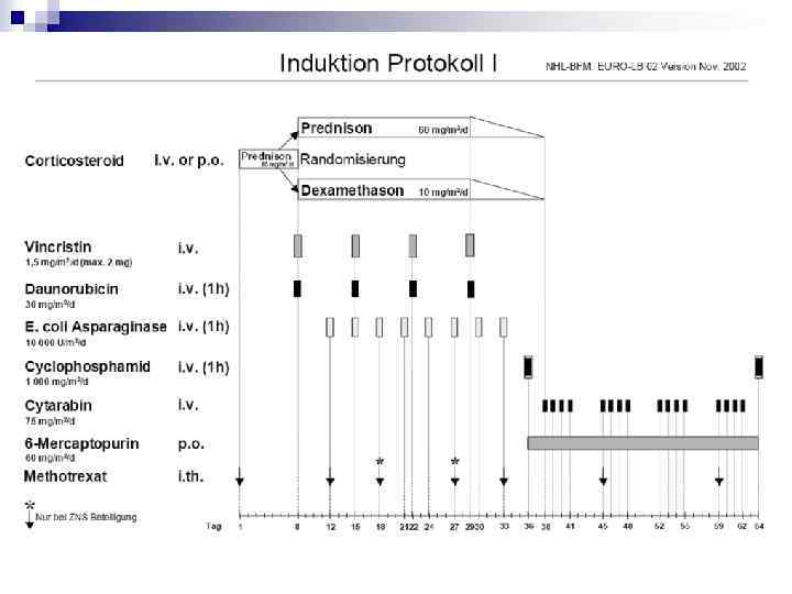 Система групп риска для В-клеточных лимфом (BFM-группа) R 1 -стадия I-IIR, первичная опухоль макроскопически полностью удалена R 2 -стадия II NR-III, первичная опухоль не удалена или удалена не полностью: ¨ ¨ только экстроабдоминальное поражение интраабдоминальная локализация при показателях ЛДГ не превышают удвоенные нормальные значения до начала ПХТ после инициальной операции. R 3 - стадия II NR, III, IV, первичная опухоль не удалена или удалена не полностью, и имеет место хотя бы один из нижеперечисленных признаков: ¨ ¨ ¨ при абдоминальном поражении увеличение ЛДГ более, чем в 2 раза от возрастной нормы перед началом ПХТ после инициальной операции поражение ЦНС поражение костного мозга мультифокальное поражение костей В-ОЛЛ(>25% бластов в КМ)