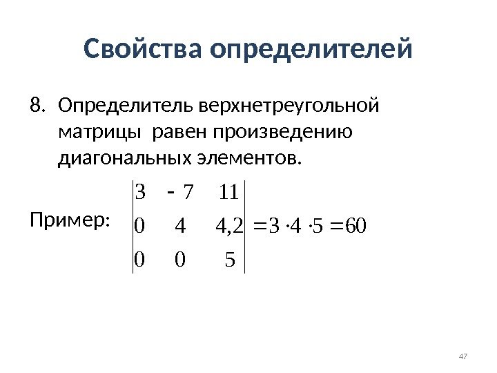 Свойства определителей 8. Определитель верхнетреугольной матрицы равен произведению диагональных элементов. Пример: 4760543 500 2,