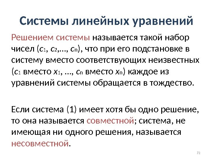 Системы линейных уравнений Решением системы называется такой набор чисел ( с 1 , с 2 , …, с n ), что при его подстановке в систему вместо соответствующих неизвестных ( с 1 вместо х 1 , …, с n вместо х n ) каждое из уравнений системы обращается в тождество. Если система (1) имеет хотя бы одно решение, то она называется совместной ; система, не имеющая ни одного решения, называется несовместной.