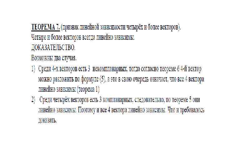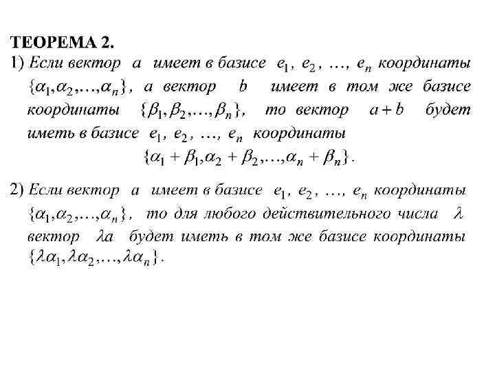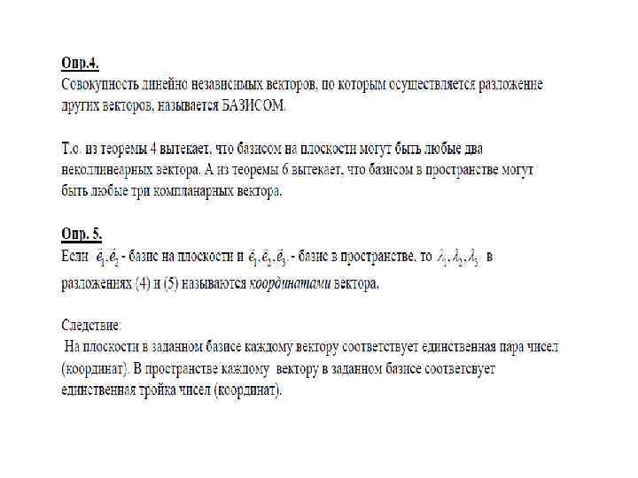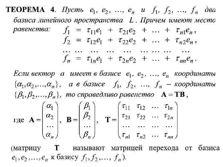 ОПРЕДЕЛЕНИЕ 6. Максимальная линейно независимая система векторов линейного пространства называется базисом этого линейного пространства. Иначе говоря, векторы e 1, e 2, …, en L образуют базис в линейном пространстве L если выполняются два условия: 1) e 1, e 2, …, en– линейно независимы; 2) e 1, e 2, …, en , a – линейно зависимы для любого вектора a из L. ТЕОРЕМА 8. Любые два базиса линейного пространства состоят из одного и того же числа векторов. Если в линейном пространстве L существует базис из n векторов, то пространство называют конечномерным, а n называют размерностью линейного пространства (пишут: dim. L = n). Если в линейном пространстве L для любого натурального n можно найти линейно независимую систему векторов, то пространство называют бесконечномерным (пишут: dim. L= ). ТЕОРЕМА 9. (о базисе). Каждый вектор линейного пространства линейно выражается через любой его базис, причем единственным образом.