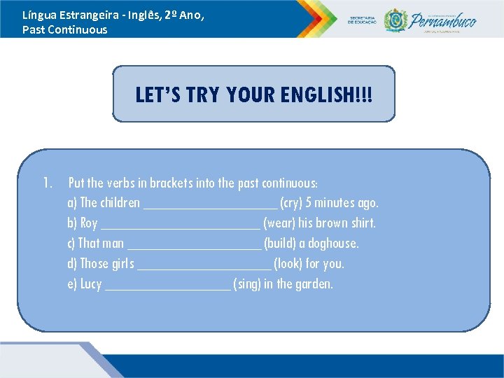 Língua Estrangeira - Inglês, 2º Ano, Past Continuous LET’S TRY YOUR ENGLISH!!! 1. Put the verbs in brackets into the past continuous: a) The children ________ (cry) 5 minutes ago. b) Roy __________ (wear) his brown shirt. c) That man ________ (build) a doghouse. d) Those girls ________ (look) for you. e) Lucy ________ (sing) in the garden.