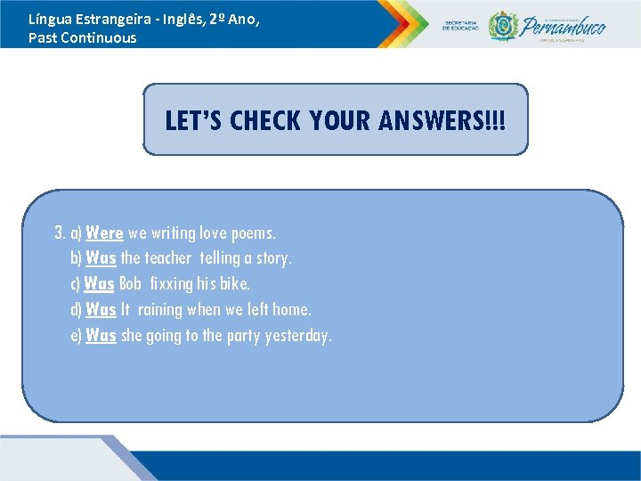 Língua Estrangeira - Inglês, 2º Ano, Past Continuous LET’S CHECK YOUR ANSWERS!!! 3. a) Were we writing love poems. b) Was the teacher telling a story. c) Was Bob fixxing his bike. d) Was It raining when we left home. e) Was she going to the party yesterday.