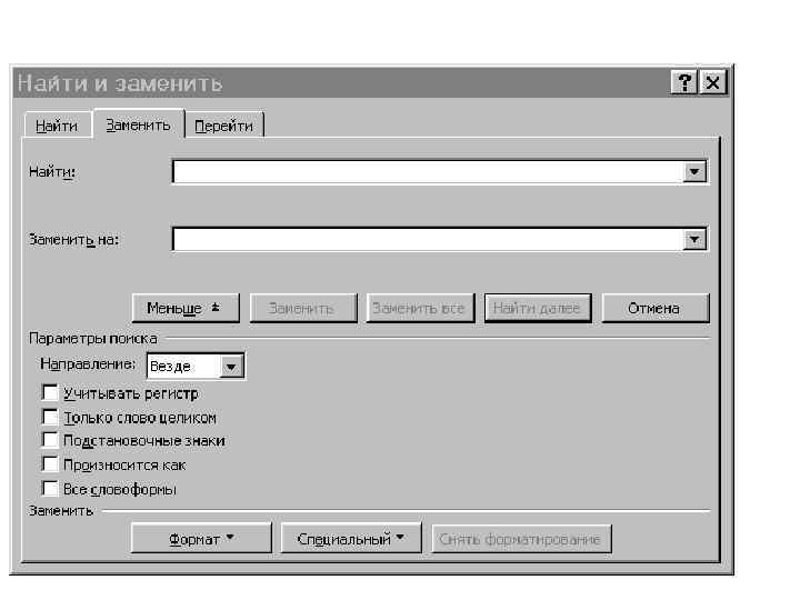 1) Преобразование текста в словник Ø Удаление ненужных символов - использование режима Подстановочные знаки - поиск и замена по шаблону (использование регулярных выражений); заменить на пустую строку или пробел): ? – любой одиночный символ (к? т) * – любое число любых символов (к*т) [ио] – любой из указанных символов (к[ио]т) [A-z] – любой символ в указанном диапазоне ^# – любая цифра … Ø Преобразование в формат «все словоформы в 1 столбец» - замена пробелов символом «конец абзаца»