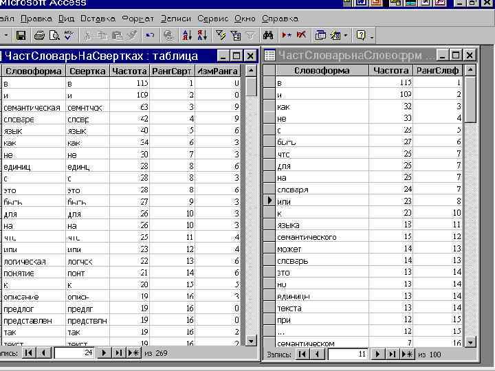 2. 2. Технология создания частотного словаря средствами стандартных офисных технологий 1) Преобразование текста в словник 2) Нормализация словоформ (метод сверток) 3) Импорт словника в таблицу БД Access 4) Создание частотного словаря (запрос Access с группировкой по словам - сверткам) 5) Выделение понятий, выраженных двух- и трехсловными словосочетаниями. 6) Сравнение «ручной» и «частотной аннотаций» . Подготовка отчета.