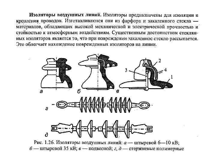 конструктивная часть ВЛ характеризуется • типом опор, • длинами пролетов, • габаритными размерами, • конструкцией фаз, • количеством изоляторов (применяют фарфоровые или стеклянные) Железобетонная опора ЛЭП 220/380 В с фарфоровыми линейными изоляторам