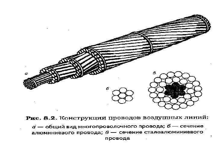 Конструкция неизолированных проводов ВЛ: а – однопроволочный; б – многопроволочный; в – сталеалюминиевый; г – многопроволочный с наполнителем; д – полый • Провода ВЛ-неизолированные из одной (однопроволочные с сечением 1… 10 мм 2; Ø 3, 5; 4 и 5 мм –стальные, медные – до Ø 10 мм) до 1 к. В или неск. свитых проволок на всех напряжениях (многопроволочные - 1, 0… 500 мм 2 - самонесущие изолированные провода).