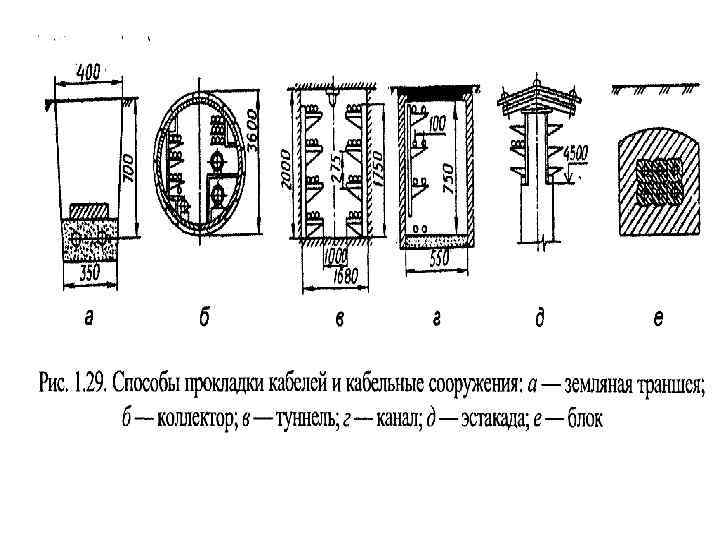 Способы прокладки кабелей • в земляных траншеях (простая, но возможны мехповреждения кабеля во время раскопок и коррозии), • каналах , • в туннелях (надежная работа кабельных линий, но дорогая прокладка, рекомендуется при наличии большего количества кабелей для питания ответственных потребителей), • на эстакадах (широко применяется с большими концентрированными нагрузками и при наличии в грунте химреагентов, блуждающих токов и различных почвенных коррозионных агентов: ü по галереям и эстакадам, специально для этого сооруженным, ü по эстакадам технологических трубопроводов с различными газами и жидкостями) • открыто по стенам зданий (строительные конструкции д. б. выполнены из несгораемых материалов, а в помещениях нет пожаро- и взрывоопасных зон).
