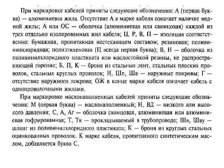 Кабели с бумажной изоляцией и алюминиевыми жилами • имеют марки: ААБАСБ, АСШв. • Первая буква обозначает материал жил (А – алюминий, отсутствие впереди буквы А в маркировке означает наличие медной жилы), • вторая буква – материал оболочки (А – алюминий, С – свинец) каждой из трех отдельно изолированных жил кабеля. Буква Б означает, что кабель бронирован стальными лентами, Шв – наружный покров выполнен в виде шланга из поливинилхлорида. ОЖ в конце марки кабеля означает кабель с однопроволочными жилами.