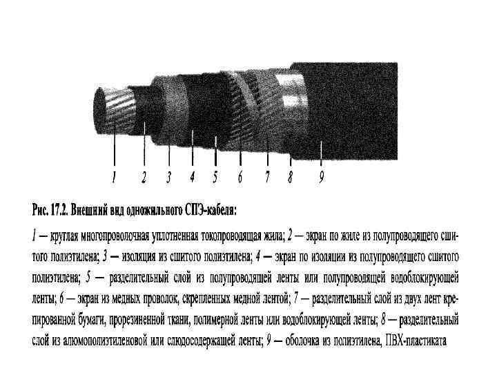 Однофазный КСПЭ • • круглой медная или алюминиевая многопроволочная жила 1; полупроводящий слой 2; изоляция из сшитого полиэтилена 3; электропроводящий слой по изоляции 4; электропроводящая лента 5; экран из медных проволок и медной ленты 6; разделительный слой 7; полиэтиленовая оболочка из полиэтилена повышенной прочности или оболочки из поливинилхлоридного (ПВХ) пластификата пониженной горючести 8.