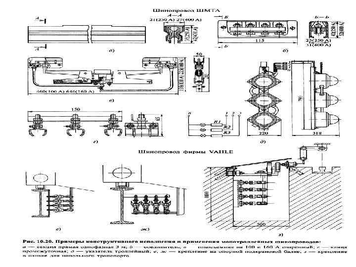 Примеры шинопроводов открытого типа • Отечественные ШМТА или фирмы VAHLE – монотроллейные, шины изолированы пофазно, выпускаются на токи до 1000 А. • Состав монотроллейных ТШ: v соединители, vтролледержатели, vклицы опорные и промежуточные, токосъемники со щетками