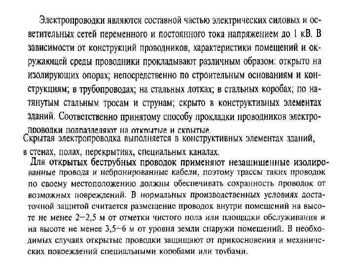 Электропроводка (совокупность проводов и кабелей с относящимися к ним креплениями, поддерживающими защитными конструкциями и деталями) Виды электропроводок: • открытая – проложенная по поверхности стен, потолков, ферм и др. строительным сооружениям, • скрытая – внутри конструктивных элементов сооружений и по перекрытиям в подготовке пола, непосредственно под съемным полом и т. п. • наружная – по наружным стенам сооружений, под навесами и т. п. , а также между зданиями на опорах вне улиц, дорог, и т. п. (м. б. открытой и скрытой). Способ прокладки, выбор типа проводника зависит от факторов: условия ОС, взрывопожароопасности, возможности мехповреждений, категории надежности электроснабжения и т. п.